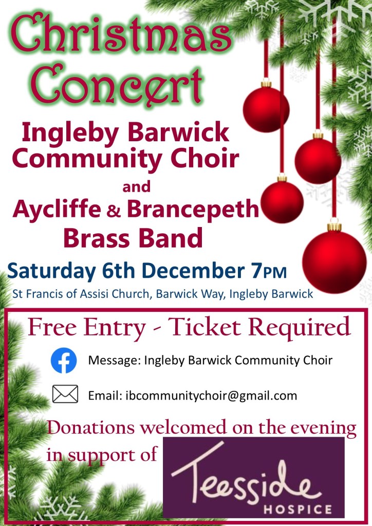 Saturday, 6th December, 7.00 pm Christmas Concert with the Ingleby Barwick Community Choir and Aycliffe and Brancepeth Brass Band at St. Francis, Ingleby Barwick. Free entry but ticket required.