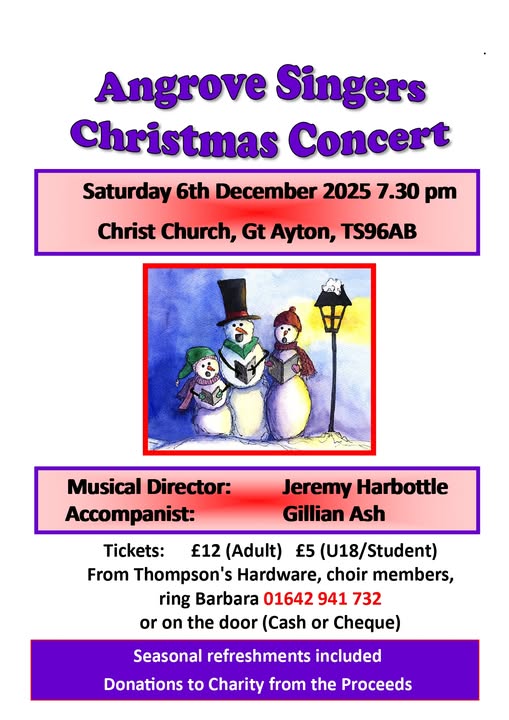 Saturday, 6th December, 7:30 pm, a Christmas concert by the Angrove Singers’ will be held in Christ Church, Great Ayton.