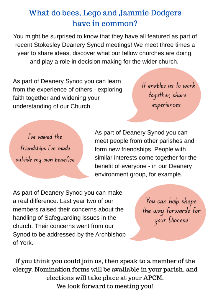 It’s coming towards the time of year when parishes elect Deanery Synod members, and several parishes have spaces for new representatives. Could it be you? Or is there someone you know who might like to stand for election?
