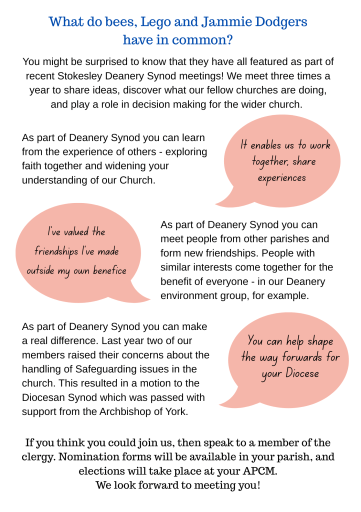 It’s coming towards the time of year when parishes elect Deanery Synod members, and several parishes have spaces for new representatives. Could it be you? Or is there someone you know who might like to stand for election?