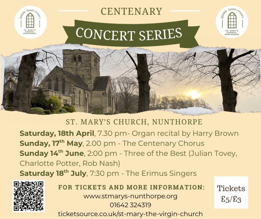 A series of concerts has been planned to celebrate the 100th Anniversary of St. Mary’s Church, Nunthorpe. The first concert is an organ recital by Harry Brown on Saturday 18th April at 7.30 pm. Tickets are only £5 and available from ticketsource.co.uk/st-mary-the-virgin-church.