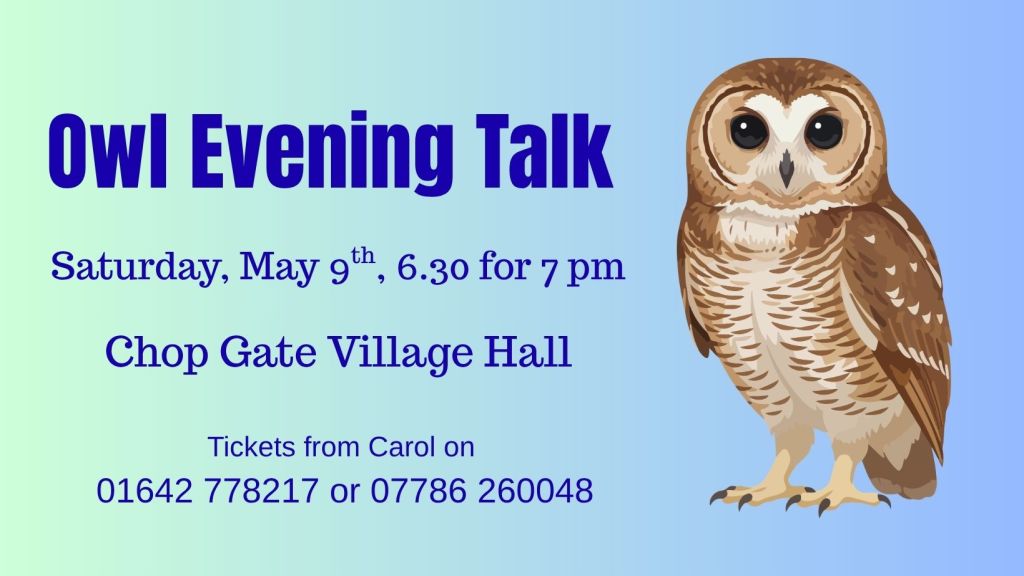 Looking forward to next month, there will be a talk at Chop Gate Village Hall all about owls. Saturday, May 9th, 6.30 for 7.00 pm. You can buy tickets from Carol on 01642 778217.