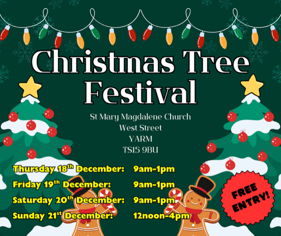 Thursday 18th December – Tuesday 23rd December Yarm Christmas Tree Festival. Christmas Tree Festival (see image below for full opening times) in St. Mary Magdalene Church, Yarm.