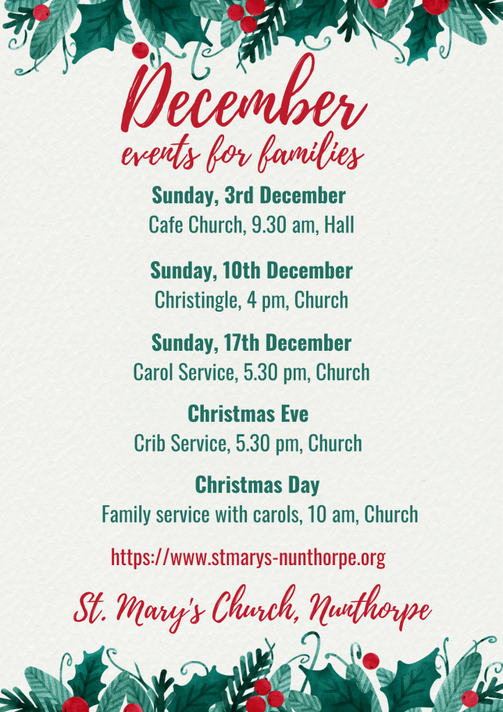 You are welcome to all these family events at St. Mary’s, Nunthorpe. In addition we will be having our regular Sunday morning services at 10 am in Church, and a ‘Midnight’ Mass at 9 pm in Church – just as midnight comes in Bethlehem.