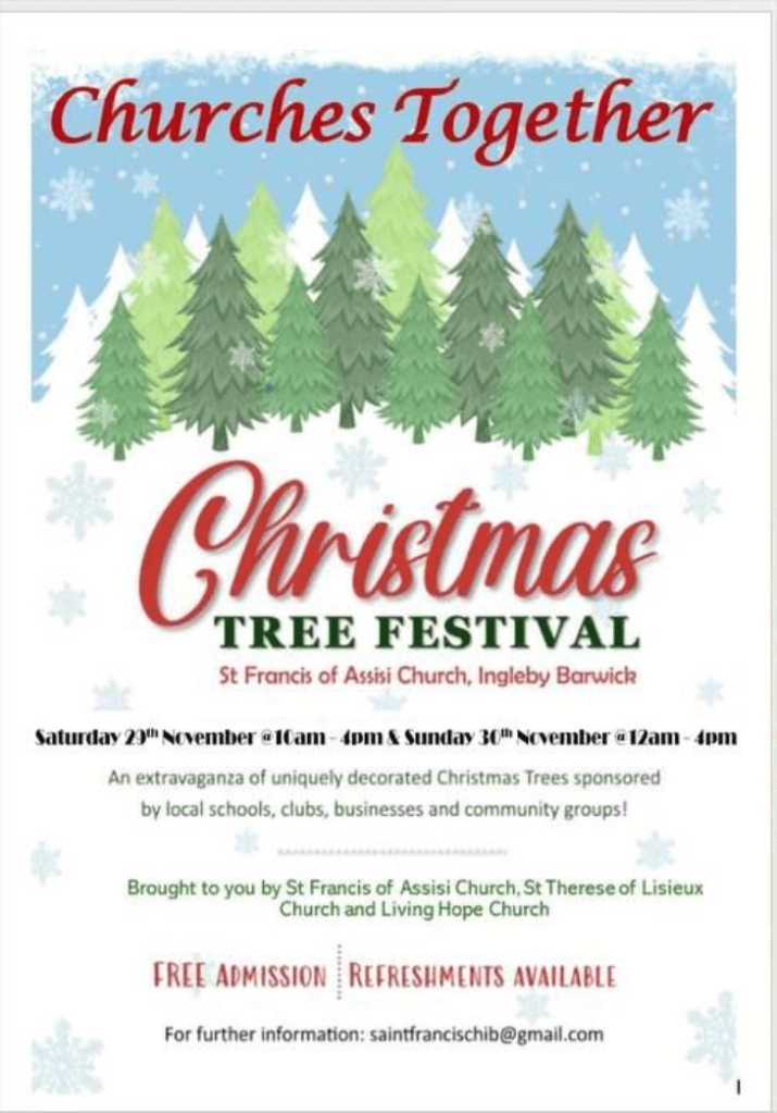Saturday 29th November (10 am – 4 pm) –Sunday 30th November (12 noon – 4 pm) Churches Together Christmas Tree Festival at St. Francis, Ingleby Barwick.