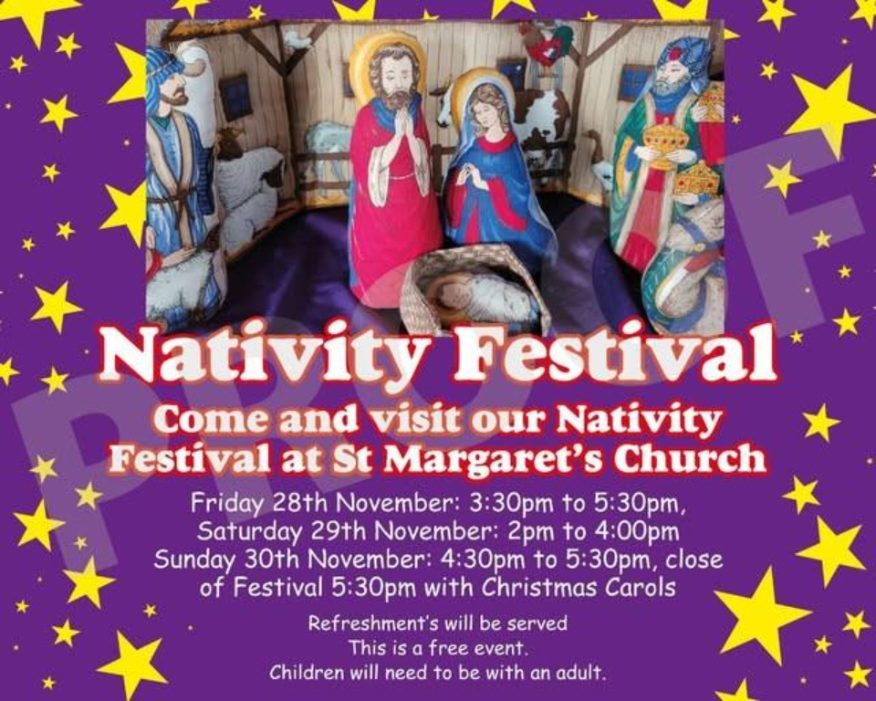 Friday 28th November – Sunday 30th November, Nativity Festival, Brookfield. Open to the public to vote for their favourite nativity, Friday 28th November, 3:30-5:30, Saturday 29th 2:00-4:00 and Sunday 30th 4:30-5:30, when the festival will close, the winner will be announced and carols will be sung. For more information please contact Revd. Vanessa Kirby on 07804 234388 or rev.vanessakirby@gmail.com