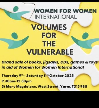 You might also want to check out ‘Volumes for the Vulnerable’, a sale of books, jigsaws, CDs games and toys in aid of Women for Women International, Thursday 9th October – Saturday 11th October, 9.30-12.30 each morning at St. Mary Magdalene, Yarm.