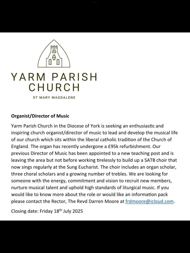 St. Mary Magdalene, Yarm, are looking for an Organist/Director of Music – see their advert below.